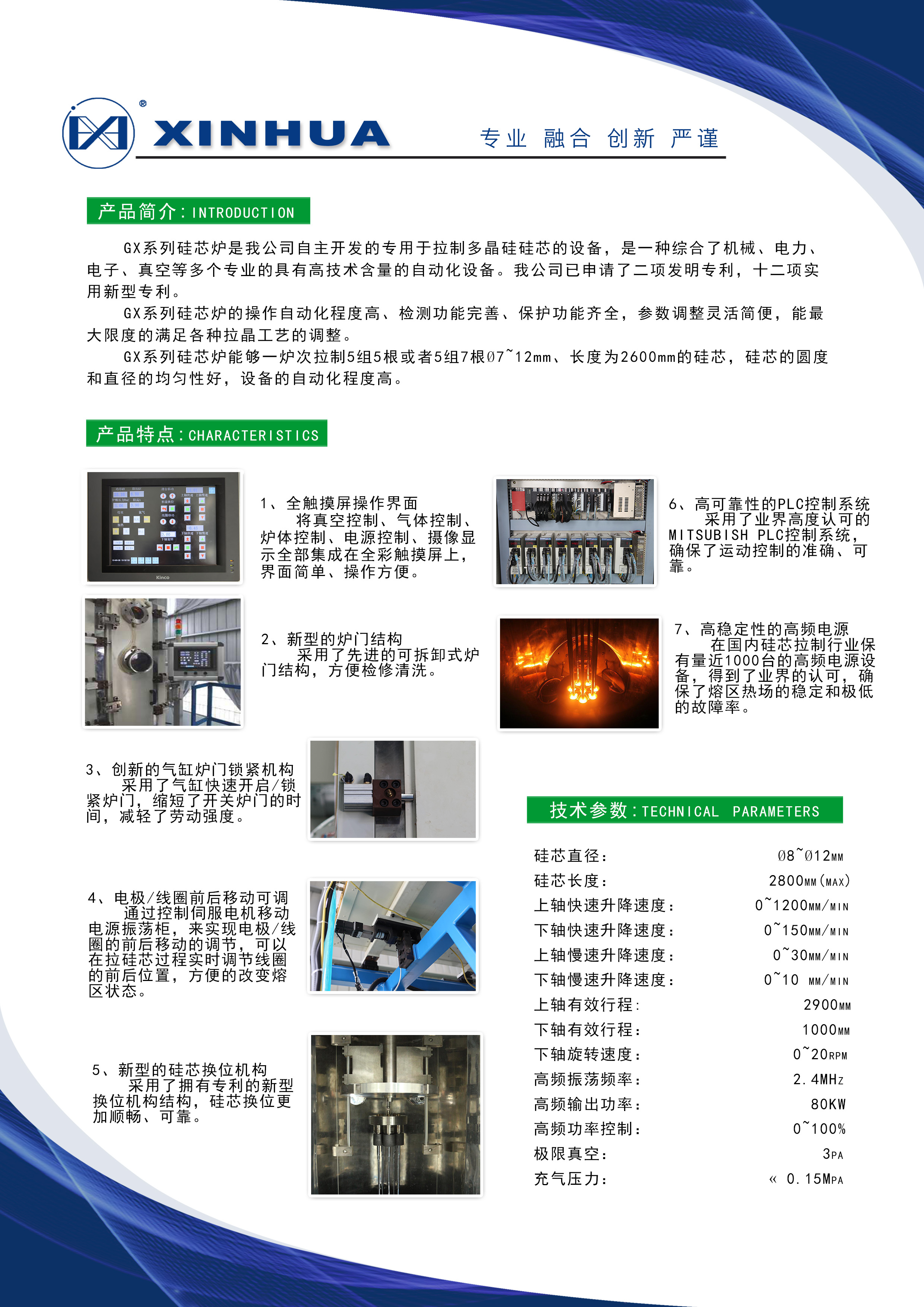 GX系列硅芯爐是我公司自主開(kāi)發(fā)的專用于拉制多晶硅硅芯的設(shè)備,是一種綜合了機(jī)械、電力、電子、真空等多個(gè)專業(yè)的具有高技術(shù)含量的自動(dòng)化設(shè)備。我公司已申請(qǐng)了二項(xiàng)發(fā)明專利,十二項(xiàng)實(shí)